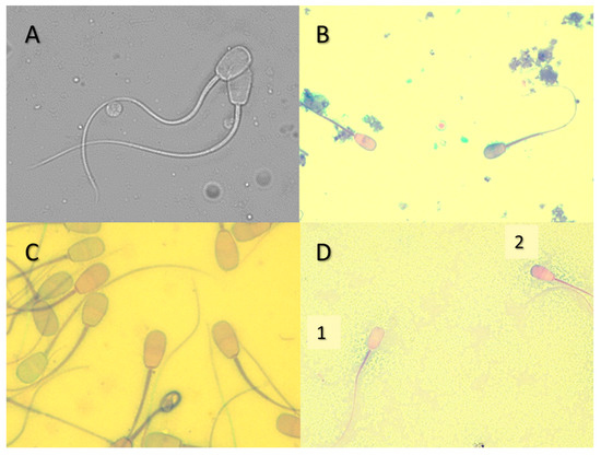 Spermatozoa from M. americana. (A) Spermatozoa in phase contrast to evaluate sperm morphology, (B–D) spermatozoa with simple acrosome dye to analyze their integrity, (D1) injured acrosome, and (D2) intact acrosome.