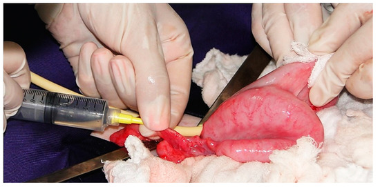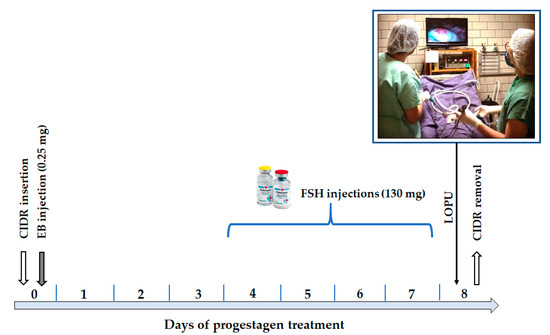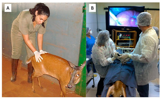To obtain oocytes in captivity hinds, a successful approach is the use of exogenous hormone treatment (to stimulate multiple follicle development and maturation) in conjunction with the LOPU (laparoscopic ovum pick-up) technique for aspiration of oocytes [108]. Similar to what was observed in MOET, hormonal protocols for ovarian stimulation present better responses when follicular growth hormones (FSH and eCG) were applied at the moment of the follicular wave emergence. Regarding oocyte collection methods, LOPU is the method of choice for medium and small deer, since it promotes faster recovery and the possibility of repeating the technique in the same female, being considered less invasive than laparotomy [109,110]. For animals that die unexpectedly (in captivity or nature), slicing of ovaries is the most widely used technique [100].