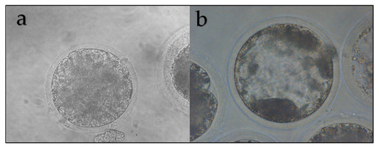 In vitro development of M. gouazoubira cloned embryos for the couples (fibroblast/cytoplast): deer/goat (a) and deer/cattle (b). 400×.