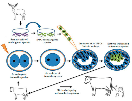 One of the most rigorous tests to assess whether iPSC strains have been adequately reprogrammed is embryo tetraploid complementation. In this technique, an embryo that is in the first cleavage (2 cells) undergoes electrofusion and then becomes a tetraploid embryo (4n). Upon reaching the blastocyst stage, the potential iPSC strains are inserted into the blastocele, and thus: (a) the cells originating from the tetraploid embryo cannot collaborate for the formation of fetal tissues since they are 4n, and (b) iPSC cells are responsible for the development of all tissues of the fetus but do not contribute to the formation of fetal attachments [139]. This would be a very interesting strategy to be applied in wild species, in which tetraploid (4n) embryos of domestic species would receive the iPSCs of the species of interest. The transfer of these chimera embryos to domestic recipients would be less likely to suffer rejection since the trophoblast is constituted by cells of the domestic species, releasing the species-specific fetal maternal recognition factors. The individuals generated would not be chimeric and their constitution would be made exclusively by iPSC cells. Unlike animals generated by iSCNT, they would not have heteroplasmy (Figure 7).