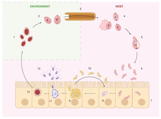 Schematic representation of coccidian life cycle. Numbers indicate the developmental stages of Eimeria spp. and the host structures involved: (1) unsporulated oocysts; (2) sporulated oocysts; (3) gastrointestinal tract; (4) mechanical rupture of oocysts and sporocyst release; (5) excystation of sporozoites; (6) released sporozoites; (7) enterocytes; (8) trophozoite; (9) mature schizont; (10) merozoites and re-infection of enterocytes; (11) macrogamete; (12) microgamete; (13) zygote.
