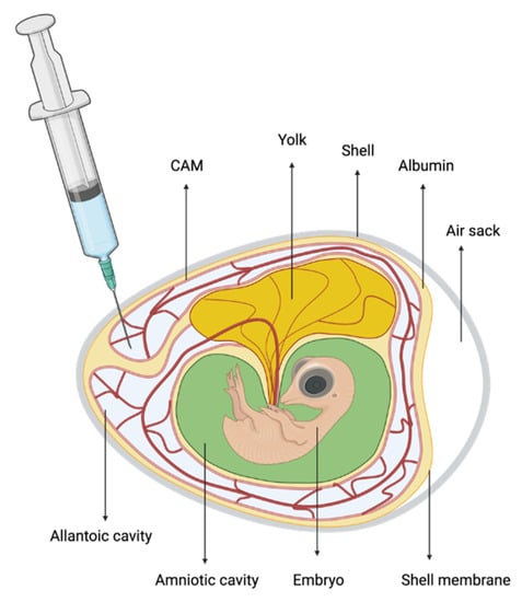 Infection of the host normally occurs by ingestion of sporulated oocysts and development of the species is usually confined to the intestine; however, embryonated eggs have been widely used as a substrate for Eimeria replication, especially for attenuated vaccine production []. In 1965, Long demonstrated that the development of E. tenella can occur at a site other than the caeca, such as the chorioallantoic membranes (CAMs) of chicken embryos. In that study, different sites of injection were tried, such as the intravenous route, amniotic route, and allantois, with different dosages of sporozoites. The best results occurred for the allantois injection (Figure 2) with 6.4 × 104 sporozoites: the CAMs of all embryos proved positive for parasites when examined between days 4 and 11 of infection with visible schizonts, gametocytes and oocysts, respectively, from days 4 and 7; and the mortality found was low. In preliminary experiments, deaths occurred in high numbers up to 24 h post injection for heavy bacterial contamination. To control this, prior to excystation, the oocysts were accurately washed and sterilized with penicillin and streptomycin (50 IU/mL), 1:500 Chloros solution, and 2% formalin solution []. A second study by Long (1966) assessed the infection of chicken embryos with E. tenella, E. necatrix, E. brunetti, E. mivati, E. acervulina, and E. maxima []. Among these species, E. brunetti, E. mivati, and E. tenella could complete the entire cycle up to oocysts; E. necatrix developed only to late schizogony, and E. acervulina and E. maxima did not develop. The life cycles were delayed compared to the in vivo natural cycle, but the oocysts recovered from the CAMs sporulated normally and induced infections in chickens, meaning that the development generated normal oocysts and it could represent a reliable tool for in vitro research [].