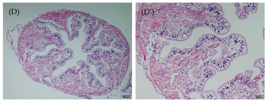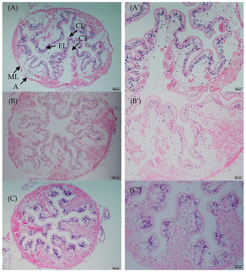 Intestinal morphology analysis of crayfish fed with different experimental diets for 14 days and 28 days. (A) control group after 14 days of feeding ((A): 100×, (A’): 50×); (B) control group after 28 days of feeding ((B): 100×, (B’): 50×); (C) treatment group (S. cerevisiae at 107 CFU/g diet) after 14 days of feeding ((C): 100×, (C’): 50×); (D) treatment group (S. cerevisiae at 107 CFU/g diet) after 28 days of feeding ((D): 100×, (D’): 50×). CL: chitinous layer; EL: epithelial layer; CT: connective tissue layer; ML: muscle layer; A: adventitia.