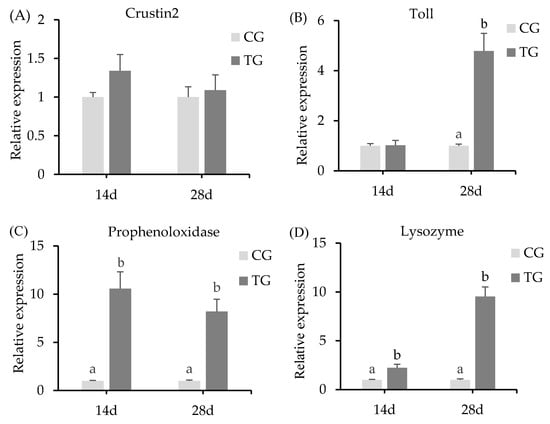 Relative mRNA expression of immunity-related genes in crayfish hepatopancreas tissue after the feeding trial. (A): Crustin2 gene expression; (B): toll gene expression; (C): prophenoloxidase gene expression; (D): lysozyme gene expression. Each value represents mean ± SD (n = 3), and bars with different letters indicate significant differences by the LSD test for each time point (p < 0.05). CG, control group; TG, treatment group (S. cerevisiae at 107 CFU/g diet).