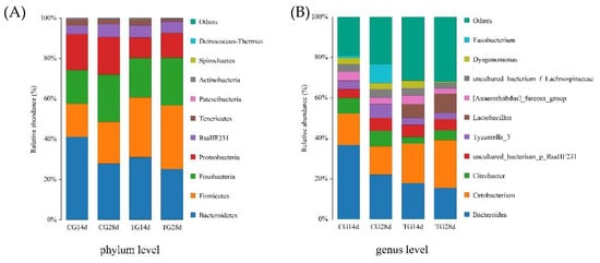 The 16S rRNA gene amplicons of microbiota were sequenced for the intestines of experimental crayfish. NGS raw data were deposited on NCBI (ID number: RJNA740135). The average number of OTUs obtained from the different samples ranged from 171 to 241, and the coverage rate of OTUs was above 99.9% (Table 3). The results showed that the Chao 1 indexes of TG14d and TG28d were significantly higher than those of CG14d and CG28d (p < 0.05). The OTUs and the Shannon index of TG14d were significantly higher than those of CG14d and CG28d (p < 0.05).