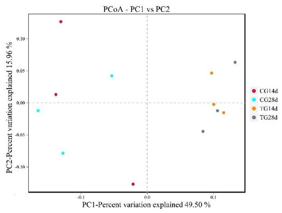 Principal coordinate analysis (PCoA) based on unweighted Unifrac distances. CG14d, control group after 14 days of feeding; CG28d, control group after 28 days of feeding; TG14d, treatment group (S. cerevisiae at 107 CFU/g diet) after 14 days of feeding; TG28d, treatment group (S. cerevisiae at 107 CFU/g diet) after 28 days of feeding.