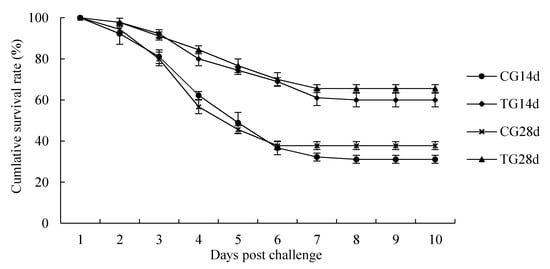 Cumulative survival following a 10-day C. freundii challenge in crayfish. Each value represents the mean ± SD (n = 3). Different letters were significantly (p < 0.05) different by LSD test. CG14d, control group after 14 days of feeding; CG28d, control group after 28 days of feeding; TG14d, treatment group (S. cerevisiae at 107 CFU/g diet) after 14 days of feeding; TG28d, treatment group (S. cerevisiae at 107 CFU/g diet) after 28 days of feeding.