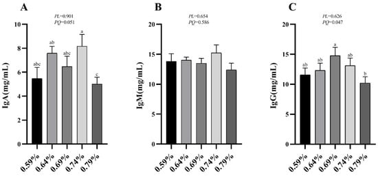 Effects of dietary valine levels on serum immune indices of laying hens. Values are represented as the mean and SEM (n = 8). Means with different superscript letters (a–c) within a column differ significantly (p < 0.05). IgA, Immunoglobulin A; IgM, Immunoglobulin M; IgG, Immunoglobulin G.