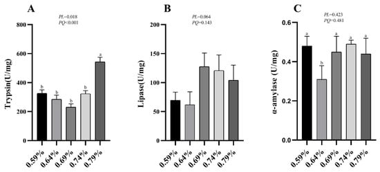 As shown in Figure 2A, the activity of trypsin showed a significant increase with the increasing of dietary valine levels (p < 0.05), and the lipase activity showed an increasing trend (0.05 < p < 0.10). No significant difference was observed in the activity of α-amylase among all treatments (p > 0.05).