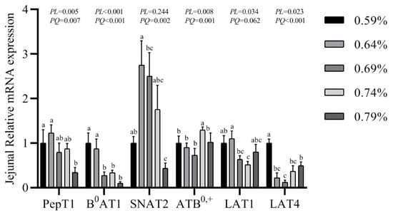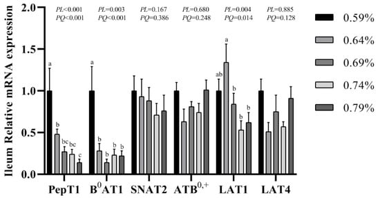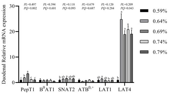 Effects of dietary valine levels on mRNA expression levels of PepT1, B0AT1, SNAT2, ATB0,+, LAT1, and LAT4 in the duodenum of laying hens. Values are represented as the means and SEM (n = 6–8). Means with different superscript letters (a–c) within a column differ significantly (p < 0.05).
