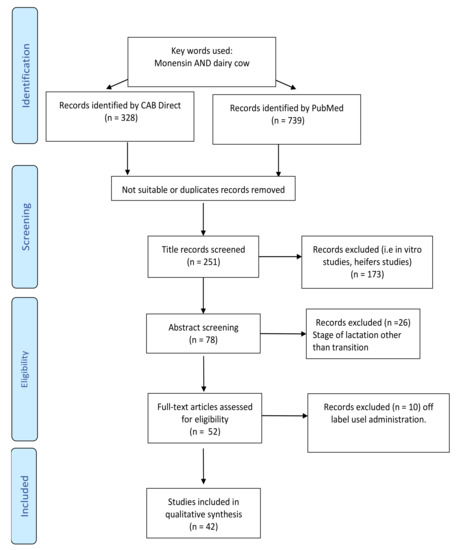 In March 2021, the available literature regarding the use of monensin in dairy cows was extracted from the CAB [11] and Pubmed [12] databases using the following key words: monensin AND dairy cow. This search resulted in 739 (Pubmed) and 328 (CAB) studies and included papers published since 1971. However, only papers published after 1996 were evaluated, considering the comprehensive review on ionophores use in dairy cattle, published by Duffield and Bagg in 2000 [1], which analyzed studies published since 1996.