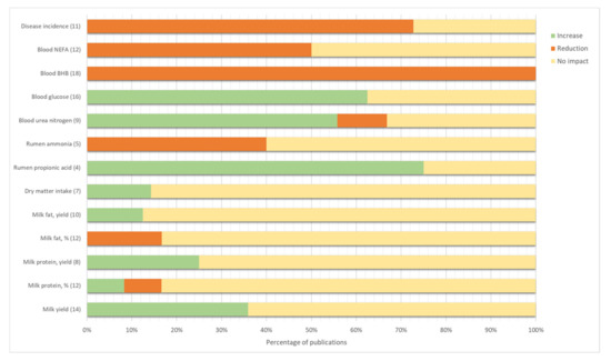 Percentage of publications that demonstrated an impact on a given outcome of monensin administration in early lactation. The effect was considered significant when differences between monensin and control had p-values lower than 0.05. No impact corresponds to non-significant differences (p-value > 0.05). The number of publications that measured the outcome is given within brackets. BHB = β-hydroxybutyrate; NEFA = non-esterified fatty acids.