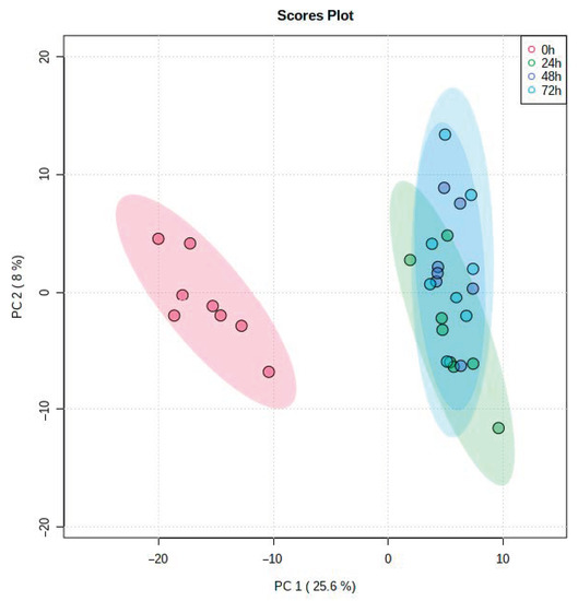 PCA plot of the gene expression profiles for the eight horses. Biopsies taken at 0 h and explants cultured up to 24, 48 and 72 h (n = 8). The analysis demonstrates clustering for the 0 h (control, representing the whole mare) and another cluster for the cultured samples (24, 48 and 72 h time points). The paler ellipses represent 95 % confidence intervals for each experimental class.