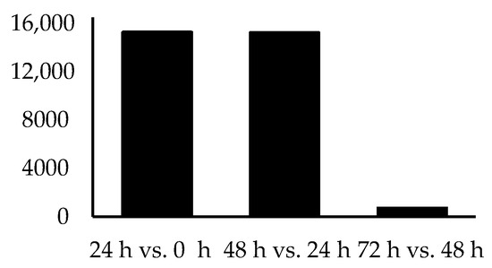 To identify the sources of variation, DEG analyses were undertaken, comparing between time points. When comparing the transcriptomes of explants cultured for 24 h to those of whole mares’ controls (0 h), 707 genes were significantly differentially upregulated and 859 downregulated. In contrast, when comparing explant tissues cultured for 48 h relative to 24 h, only 53 genes were significantly upregulated while 27 genes were downregulated. Finally, the transcriptome of explants cultured for 72 h revealed no differentially expressed genes compared to 48 h samples. Table 1 compares the number of expressed genes (background genes) and the number of DEGs between timepoints, whilst Figure 2 and Figure 3 graphically represent data featured in Table 1. It should be noted that unlike the 0–48 h period relatively few genes were expressed within the 48–72 h window.