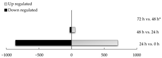 Comparison of differentially expressed genes at all time points. Comparison of up and downregulated genes between all-time points (p < 0.05; Log2FC ≥ ± 2). * The comparison between 48 and 72 h of culture did not retrieve any DEG.