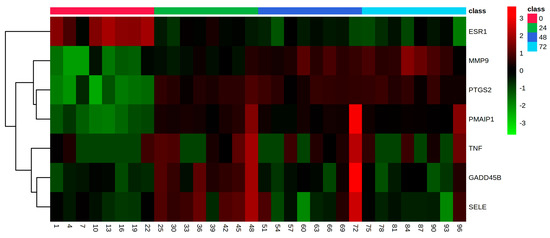 Genes previously used as biomarkers of endometrial function [17] were also studied to better understand explants’ functionality once in culture. The oestrogen receptor, ESR1, was upregulated at 24 h vs. 0 h (FDR = 1.48 × 10−15; Log2FC = −2.5), however it was not differentially expressed at 48 vs. 24 h (FDR = 0.35; Log2FC = 0.5). Whilst PTGS2, prostaglandin-endoperoxide synthase 2, was upregulated at 24 h vs. 0 h (FDR = 1.97 × 10−27; Log2FC = 6), it was not differentially expressed at 48 h vs. 24 h of culture (FDR = 0.99; Log2FC = −0.01). The possible initiation of cell death was considered by examining the expression of GADD45B (growth arrest and DNA-damage-inducible beta I) and PMAIP1 (phorbol-12-myristate-13-acetate-induced protein 1) [17]. GADD45B was not differentially expressed at 24 h (FDR = 3.2 × 10−4; Log2FC = 1.6) nor at 48 h (FDR = 0.35; Log2FC = −0.6) using the usual comparisons. PMAIP1 was upregulated at 24 h (FDR = 1.64 × 10−13; Log2FC = 3.1) but not differentially regulated at 48 h of culture (FDR = 0.79; Log2FC = 0.2). Figure 4 displays a heatmap showing the expression pattern (count matrix) of the biomarker genes: ESR1, MMP9, PTGS2, PMAIP1, TNF, GADD45B and SELE. This indicted a transient increase in expression by most biomarkers at 24 h whilst ESR1 was suppressed. At 48 and 72 h consistent elevated expression of MMP9, a matrix metallopeptidase, was seen in each horse explant. Expression of PTGS2 (prostaglandin processing gene) and PMAIP1 was induced at 24 h and maintained in each horse explant up to 72 h. Correlation analyses indicated that ESR1 was inversely correlated with all biomarker genes and most clearly with PTGS2 (Figure S1). In turn, PTGS2 was positively correlated with all biomarker genes but ESR1.