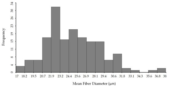 In this section, reference data obtained was compared with analyses of llama, alpaca and sheep wool. The MFD mean value shown in Table 1 (25.16 µm) was similar to those reported by Frank and Hick [49] but higher than 23.9 µm obtained by Mueller et al. [6] in Catamarca. In Southern and Central Argentina, values of MDF obtained were 25 µm [6], 26.2 µm [50] and 28.7 µm [11]. Moreover, the minimum (17.82 µm) and maximum (37.71 µm) values were slightly different than values reported by Laime Huarcaya et al. [45] for Peruvian llamas (16.18 µm and 41.42µm) and 16.4 µm and 34.2 µm reported by Canaza-Cayo et al. [13] in alpaca fibres. Several reports have established that average fineness in Argentinian llama fibres is about 23 µm [6,31,47,51]. Similar values were reported in Bolivia and Perú [45]. It must be noted that all values mentioned correspond to analyses made on raw fibres.