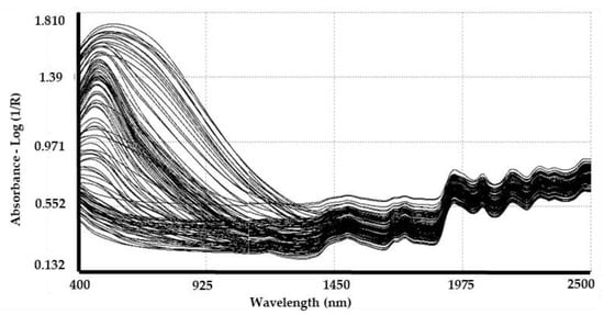 Visible and near infrared reflectance from raw spectra of all samples. Axis: absorbance (log 1/R) vs. VIS–NIR wavelength (400–2500 nm).