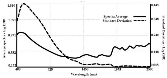 Average and standard deviation of all spectra (400–2500 nm) are shown in Figure 3. Standard deviation shows prominent values in the 400–1400 nm region explained by the colour diversity of the samples. From 1400 to 2500 nm, smaller variations can be noted related to the main absorption bands in the average spectra [13]. The average spectra show absorption bands at 1450 nm assigned to the first overtone of the O–H stretching vibration of water. Bands around 1900 nm were assigned to combinations of the O–H stretch and H–O–H bending vibrations of the hydroxyl group from water. Double peaks around 1700 nm were associated with the first C–H stretch overtones of lipids and protein side chains. The segment between 2000 and 2500 nm provides information on amino acid composition and molecular conformation of animal keratin fibres. For example, absorption bands around 2055 nm, 2160 nm and 2290 nm are related to combination bands of N-H groups present in the α-helix and β-sheet structure of keratin [48].