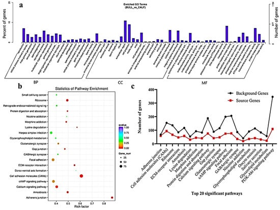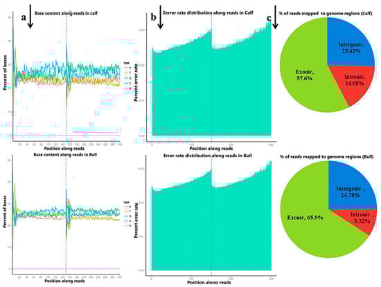 The raw reads were filtered and classified into different segments; consequently, 98.95% (70,333,218 clean reads) of the sequencing data was screened, containing N 0.05% (38,769) reads, low-quality 0.18% (126,760) reads and adopter-related 0.82% (584,096) reads for the bulls, and similar classifications were done for the calve, including clean reads (70,218,119, 98.48%), containing N (37,396, 0.05%), low-quality (141,228, 0.20%) and adopter-related (905,921, 1.27%) (Figure S5). The raw reads for the total samples were found between 118,785,372 and 142,165,686, while the clean reads per sample were 116,004,150 and 140,666,436. Thus, the raw reads and clean reads yielded together 90 GB data, and the GC contents were 47.09–53.57% (Figure 1a). The sequencing process itself has the possibility of machine errors. The distribution check of the sequencing error rate can reflect the quality of the sequencing data, and the sequencing error rate distribution test is used to detect the error % in the sequencing of samples (Figure 1b). All the % Q20 values of the subjected reads in six samples were surpassed by 97%, and all the details are shown in Table S3. More than 95.5% of the clean reads were aligned to B taurus UMD3.1 and are shown in (Figure 1c).
