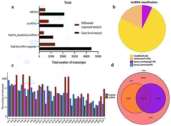 We classified and identified lncRNAs based on the position and direction of their genomic regions relative to mRNAs. A total lnc-mRNA magnitude of 44,279 was found in the calf and bull testes, where, at the gene level analysis, 21,250 mRNAs and 20,533 lncRNAs are identified (Figure 2a). We established an accurate putative lncRNAs and mRNAs network from the assembled transcripts with a stringent pipeline. Based on the structural characteristics and genomic position, the lncRNAs were classified into four subclasses, though denoted as lincRNA (75.4%), antisense (17.6%), sense-overlapping (7.0%) and sense-intronic (0.0%) (Figure 2b). The lncRNAs were overlapped in same or in the opposite direction with the exonic or intronic parts of the coding gene; thus, they became exonic-sense, exonic-antisense, intronic-sense or intronic-antisense, respectively. The genomic locus that was more than 1 kb from any mRNA-encoding genomic region was considered as a long intergenic ncRNA (lincRNA). According to this classification scheme, we found that most testis-specific lncRNAs (75.4%) were lincRNA. We examined the chromosomal localization of the testicular lncRNAs and mRNAs and identified the loci that expressed these transcripts. Our research confirmed that the transcripts were uniformly spread throughout the chromosomes of the bulls and calves (Figure 2c). The coding potential of the lncRNA and mRNA were analyzed by using CPC2, CNCI and Pfam software, and a total of 35,409 coding transcripts were identified (Figure 2d).
