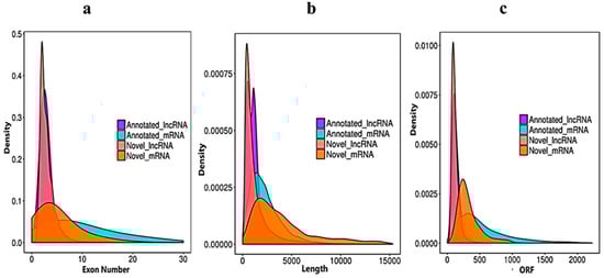 We verified the general characteristics of the novel lncRNAs and mRNAs by comparing the transcript length, exon number and ORF length, which also differentiated between the lncRNAs and mRNAs. The number of exons of mRNAs about (30) was higher than of the lncRNAs (10). The majority of lncRNAs have three or less than three exons, whereas mRNAs have five or more exons (Figure 3a). In the length comparison, we observed that the lncRNAs (an average of 2000 bp) were significantly shorter than the mRNAs (an average of 3000 bp), as shown in (Figure 3b). The open reading frame (ORF) is the normal nucleotide sequence of a structural gene. From the initiation codon to the termination codon, the open reading frame encodes a complete polypeptide chain, without any interruption in the translation. When we compared the lncRNA with mRNA ORFs, the sequences of annotated mRNAs and annotated lncRNAs were extracted by annotations of the known gene structure. The obtained ORF sequence was converted into a protein sequence, and the length distribution was obtained (Figure 3c).