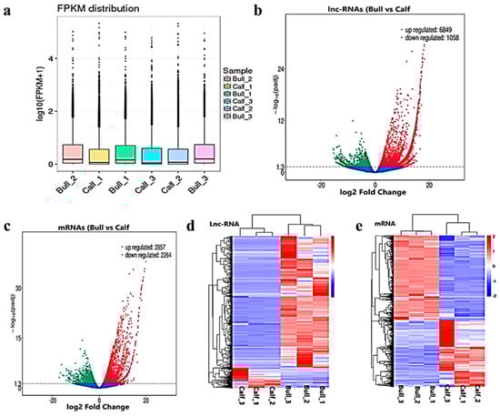 Differential expressed level of the transcripts and protein-coding genes in the testes. (a) The distribution of the expression levels of the genes or transcripts in different samples is shown by a box graph. The boxplot of each region corresponds to five statistics, e.g., the maximum, upper quartile, median, lower quartile and minimum, respectively. (b) The volcanic map visualizes the overall distribution of the lncRNAs genes with significant differences in their expression. (c) Differential mRNA expressions between the calves and bulls. The upregulated genes are represented by red dots, downregulated genes by green dots and the blue dots are genes without significant changes. (d) Clustering map of DE lncRNAs among the calf and bull testes sample. (e) Clustering map of the DE mRNAs among the samples. Red indicates upregulated coding genes, and blue indicates downregulated gene products.