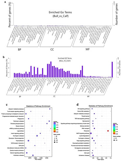 After isolation of the reads with adaptors and a poly-N greater than 10% and poor-quality reads from raw data using in-house perl scripts produced by the Bioinformatics Institute (Beijing, China), clean transcriptomic data were obtained. The ribosomal RNAs free reads of each calf and bull sample were charted to reference genome Bos taurus-UMD 3.1.1 by TopHat2 (v. 2.0.3.12), as described in reference [,]. Bowtie v2.0.6 was used to build an index of the bovine reference genome [], and the paired-end clean reads were aligned using TopHat [] v2.0.9 (https://ccb.jhu.edu/software/tophat/index.shtml, accessed on 11 November 2019). The mapped reads of each sample were assembled by both Scripture (beta2) [] and Cufflinks v2.1.1 [].