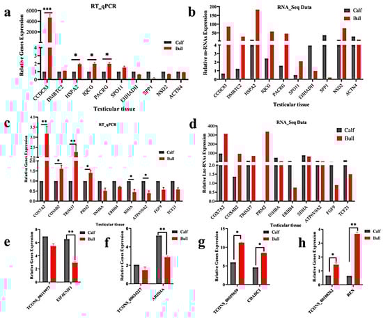 Validation of the RNA-Seq results via RT-qPCR in the immature and mature stages of bulls. The penal figures (a–d) compared the DE mRNA and lncRNA sequencing results and the RT-qPCR findings. The penal figures (e–h) showed the expression decoration of four lncRNAs and their cis-acting genes in two different developmental stages. The data were measured by the 2−ΔΔCt method, and GAPDH was used as the housekeeping gene. The data are presented as the mean ± SEM, where * p < 0.05, ** p < 0.01, *** p < 0.001.