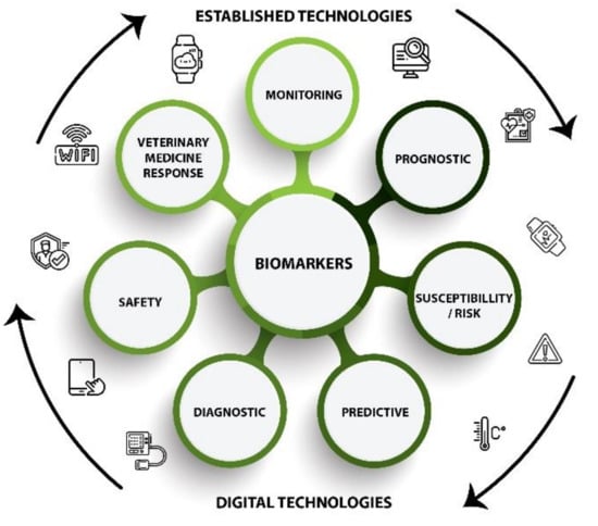 Digital phenotyping has been most heavily studied in humans because it provides great opportunities for medical advancement with minimal chances for negative side effects. The phenotypes are chosen and assessed in relation to biomarkers, which are digital measurements of phenotypes (Figure 1) that are categorized according to the intended use of the collected data. The assessment of medical issues in individuals is relatively similar across the spectrum of complex living organisms, especially mammals, which makes these biomarker categories valuable for use within the agricultural industry [].