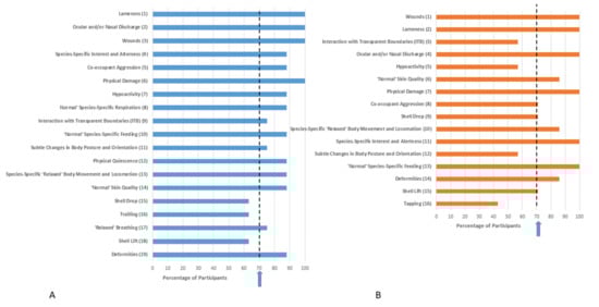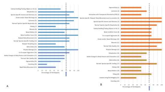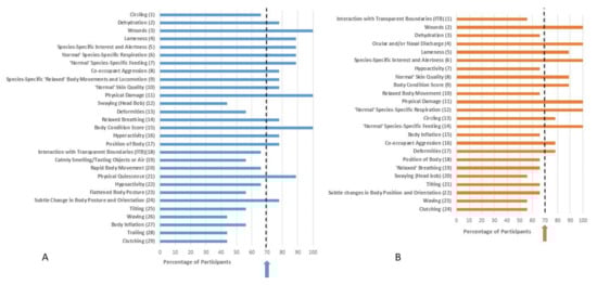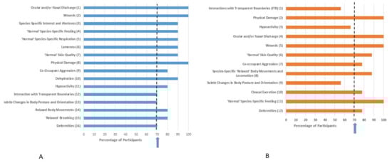 | Ocular and/or Nasal Discharge | Species-Specific ‘Relaxed’ Body Movements and Locomotion | Species-Specific ‘Relaxed’ Body Movements and Locomotion Normal’ Species-Specific Respiration Ocular and/or Nasal Discharge (ranked equally) |