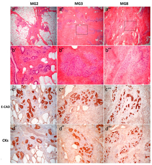 Histological and immunohistochemical features of abdominal porcine mammary glands MG2 (a’, b’, c’, d’), MG3 (a’’, b’’, c’’, d’’) and MG8 (a’’’, b’’’, c’’’, d’’’). Hematoxylin and eosin (H&E) (a’, a’’, a’’’) 6.3× objective and (b’, b’’, b’’’) 25× objective. Rectangles in (a’, a’’, a’’’) indicate areas magnified in (b’, b’’, b’’’, respectively). All three tissue samples show resting mammary gland with glandular parenchyma showing interlobular and intralobular ducts and, mainly in MG3 (a’’, b’’), intralobular branching ducts lacking in MG2 (a’, b’). There is a variable extent of adipose tissue among samples (MG2, a’) or dense collagen stroma (MG3 and MG8, a’’ and a’’’, respectively). By immunohistochemistry, an epithelial E-Cad/panCK positive phenotype is evident in all the three MG samples (c’, c’’, c’’’ and d’, d’’, d’’’, respectively).