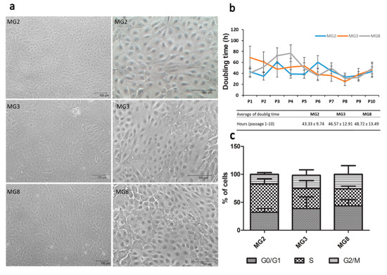 Primary cells were obtained from all three animals with different quantitative rates: 1.1 × 105 cells/g of tissue from MG2 and MG8; 2.1 × 105 cells/g of tissue from MG3. Cells were isolated and expanded until P10 showed a typical cobblestone morphology (Figure 2a) that was maintained through the different passages. However, in higher passages “lumen like structures” were present in all three primary cell lines, more frequently in MG8 pMECs (Figure S1). All three primary cell lines were detected as negative for mycoplasma contamination during expansion. Doubling time data indicated that cells grew with a similar rate (Figure 2b). The DNA index was normal for all three cell populations, with a mean value of 0.996 ± 0.047. Regarding cell cycle, selected single populations show the three distinct phases that could be recognized in a proliferating cell population. Statistically significant difference was not observed between the three primary lines regarding cellular distribution in the different phases of the cell cycle (Figure 2c).
