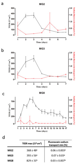 The barrier function of pMECs was evaluated via TEER and fluorescein sodium transport. TEER is a well-established method to evaluate the integrity of epithelial monolayers via measurement of the ionic conductance of the paracellular pathway [26], whereas fluorescein sodium is used to measure the passive paracellular transport [27]. For MG2 and MG3 pMECs, a plateau in TEER values (+/− 350–400 Ω × cm2) was already reached after two to three days, followed by a quick drop in TEER values on day four. Similarly, fluorescein sodium transport reached values around 0.06% at day two, and increased again after day four (Figure 5a,b). MG8 pMECs showed a different pattern in both TEER and fluorescein sodium transport: the initial increase in TEER was slower, a maximum of 829 Ω × cm2 was reached at the day 5 (Figure 5c). Afterwards, TEER values also decreased, but were still higher than the maximal values reached in MG2 (368 Ω × cm2) and MG3 (393 Ω × cm2) for up to 15 days. Similarly, fluorescein sodium transport was low in a period starting from day 3 up to day 16 (Figure 5c). Furthermore, statistically significant differences are evident in TEER maximum values and in fluorescein sodium transport minimum values reached between MG2, MG3 and MG8 (Figure 5d).