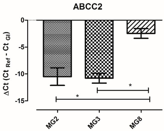 Among the 84 analyzed genes, only three were not detectable (ABCC12; SLC22A3; SLC22A8). The level of expression of each gene is similar among the three animals. The only gene that shows a variation in ΔCt higher than five cycles among animals is ABCC2. A single qPCR reaction confirmed the statistically significant higher expression of ABCC2 gene in MG8 pMECs respect to the other cell lines (Figure 7).