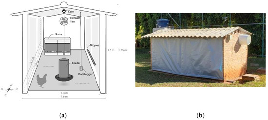 Three models of sheds were used on a reduced scale, arranged in an east–west orientation, where the birds were housed in a 15 cm high shavings bed. Each poultry house had two 40 × 40 × 40 cm3 box-type nests installed, a pendular feeder (Φ 30 cm), and four nipple drinkers, as shown in Figure 1a.