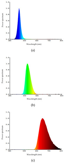 Luminous spectra of the lamps used in the experiment: (a) Model TKL Colors—Blue; (b) Model TKL Colors—Green; (c) Model TKL Colors—Red. (Data provided by the manufacturer).