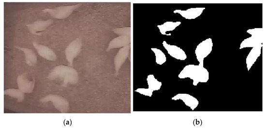From the framing obtained by the cameras inside each shed, an area free of objects and equipment was defined, so that the activity of the birds could be monitored. This area was delimited in the first frame and replicated for all consecutive frames of all the video files that composed the samples. The images were processed and analyzed using MATLAB® software. In the image processing, low-pass filters and threshold-based segmentation techniques were applied so that only the birds were highlighted (Figure 3).