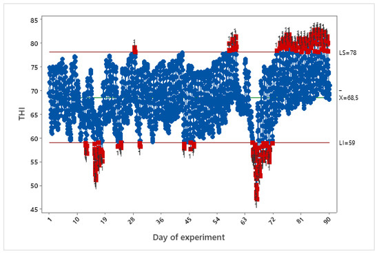 Figure 4 shows the variation of the THI for each hour during the entire period of the experiment. When the THI values of the environment are below or above the thermoneutrality limits defined in the literature, the values are highlighted in red.