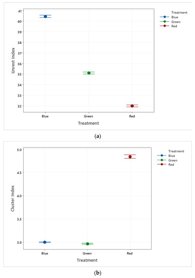 Confidence intervals of the mean for the (a) unrest index and (b) cluster index verified for the blue, green, and red light treatments.