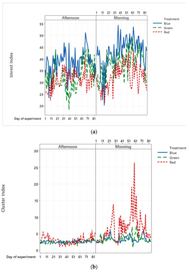 Two indicators were used to describe the group behavior of birds: the cluster index, described by [37] and the unrest index, described by [40]. The cluster behavior is characterized by the reduction in distances between individuals and the pillaging of these birds. On the other hand, the unrest behavior is associated with the movement of the flock in the experimental house.