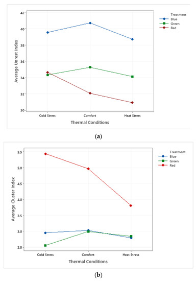 In Table 1 and Table 2, the means comparison test was applied for the crossover results of lighting treatment for periods of the day and thermal environments in which the unrest and cluster behaviors were evaluated. The results confirm the evidence presented in the previous figures.