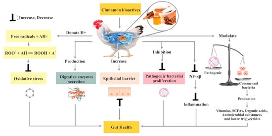 Furthermore, consumers are demanding poultry meat with less fat, and the search for safe growth promotants and carcass modifiers has also become a priority research area. Thus, PFAs have been studied as alternatives to AGPs and growth modifiers to provide safe and wholesome food. Natural antioxidants found in many PFAs have been found effective in extending the shelf life, meat quality and acceptability of poultry meat. Phytochemicals from herbs and spices have attracted particular attention as alternatives to AGPs due to their beneficial properties. Being natural, non-toxic, chemical residue-free and easy availability made them highly acceptable in the poultry industry. Natural products from plants have been found to have beneficial effects viz. appetizer, increased digestive enzymes secretion, immuno-stimulant, bactericidal, antiviral and antioxidants in animals. Cinnamon is one of the most potent PFAs, which has great potential for poultry. Therefore, there is a crucial need to review the impacts of cinnamon bioactive compounds on the gut microflora and overall health performance of chicken and develop various effective mitigation strategies to overcome the significant production loss and attain successful production in hot climatic regions or areas. Overall, the effect of cinnamon on poultry gut health is given in Figure 1.