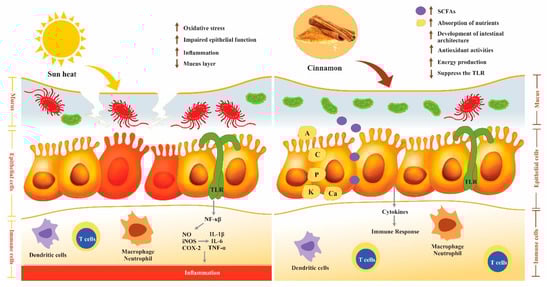 Effect of heat stress on immune response and cinnamon contribution to modulate oxidative stress due to pathogenic bacteria impaired the epithelial cells and mucus and cause inflammation by triggering the toll-like receptors (TLR) (Left side). Cinnamon improved the intestinal lumen by improving the growth of commensal bacteria and suppressing the TLRs. Good bacteria produce SCFAs, develop the intestinal architecture and produce energy (Right Side).