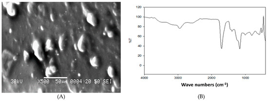 Sodium alginate (A-2033), garlic oil (W250320) and acrylic acid (147230) were purchased from Sigma-Aldrich (Saint Louis, MO, USA). Sodium alginate was dissolved in 1% distilled water using various ratios of acrylic acid. Network structure of sodium alginate was formed by gamma irradiation using hydrogels solutions, and then acrylic acid and sodium alginate solutions were blended until complete compatibility. The prepared mixture was then subjected for gamma irradiation (35 kGy) at the Atomic Energy Authority, Egypt. Characterization of the prepared G-NHG was done using a scanning electron microscope (Figure 1A) and Fourier-transform infrared spectroscopy (FTIR, Figure 1B).
