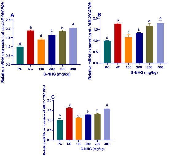 The transcriptional levels of genes encoding tight junction proteins, TJP (occludin and JAM-2), were significantly (p < 0.05) increased in groups received G-NHG regardless to challenge with C. perfringens. Meanwhile, all groups except that received 100 mg/kg of G-NHG showed a significant (p < 0.05) upregulation of Muc-2 gene (Figure 3). The expression of occludin was significantly (p < 0.05) increased with increasing levels of G-NHG (up to 2.06-fold) when compared with PC group (Figure 3A). Groups received 300 and 400 mg/kg of G-NHG showed the most significant (p < 0.05) upregulation of JAM-2 gene (1.7 and 1.8-fold, respectively, Figure 3B). The highest significant (p < 0.05) expression of Muc-2 gene was observed in birds received 400 mg/kg of G-NHG (1.5-fold, Figure 3C).