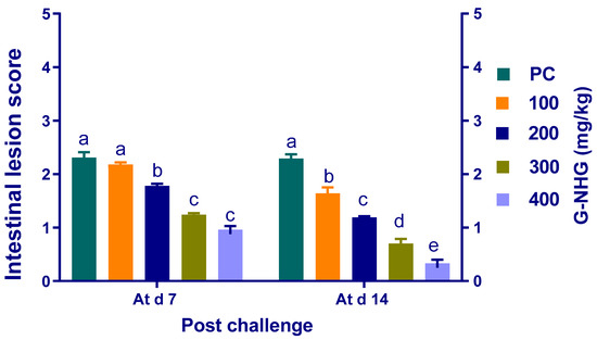 The results revealed that unchallenged birds exhibited no intestinal lesions (Figure 4). Generally, intestinal lesion scores were decreased in all groups supplemented with G-NHG in comparison with the PC group. At 7 d post challenge, the decline in intestinal scoring was significant (p < 0.05) in all groups that received G-NHG, except the group that received 100 mg/kg of G-NHG. Compared with PC group, intestinal lesion severity in birds fed G-NHG was significantly (p < 0.05) reduced in a dose-dependent manner at 14 d post challenge.