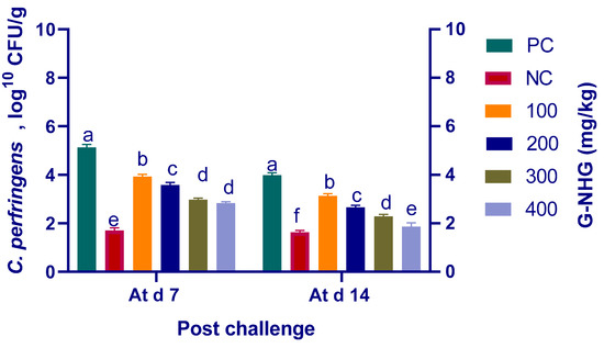 The results of C. perfringens quantification in the ileal digesta are presented in Figure 5. The results demonstrated that G-NHG at various supplementation levels significantly (p < 0.05) reduced C. perfringens log10 numbers of copies with respect to the PC group at 7 and 14 d post challenge. The C. perfringens populations decreased with increased G-NHG levels at both intervals. At 7 d post challenge, the lowest C. perfringens counts were observed in the birds fed 300 and 400 mg/kg of G-NHG (2.16 and 2.30 log units decreases than the PC group), but with no detectable significant differences. At 14 d post challenge, the mean values of C. perfringens loads corresponding to the different supplementation levels were statistically significant (p < 0.05). Supplementing diets with 400 mg/kg of G-NHG was found to cause a 2.14 log CFU/g reduction of C. perfringens ileal counts than the PC group. The mean value for C. perfringens populations in this group was restored near to that in the NC group.