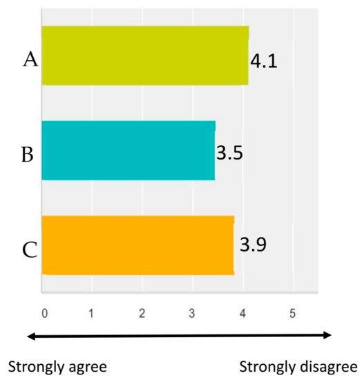 Scenarios regarding the reduction and cumulative use of research animals. (A) Animals of any species should not be removed from the research program, regardless of use, as this necessitates purchasing new replacement animals (i.e., contradicts reduction principle). (B) Provided that there is no physical trauma, such as rectal mucosal tears, it is acceptable for students to perform rectal examinations on teaching mares twice weekly for the mare’s entire institutional life (e.g., 10 + years). (C) As long as the maximum blood volume guidelines are adhered to, it is acceptable to perform an unrestricted number of venipunctures on a rat in a pharmacokinetic study. 0 = Strongly agree, 5 = Strongly disagree.