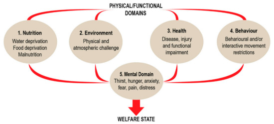 - Mellor, D.J.; Beausoleil, N.J.; Littlewood, K.E.; McLean, A.N.; McGreevy, P.D.; Jones, B.; Wilkins, C. The 2020 Five Domains Model: Including Human–Animal Interactions in Assessments of Animal Welfare. Animals 2020, 10, 1870. [Google Scholar] [CrossRef]